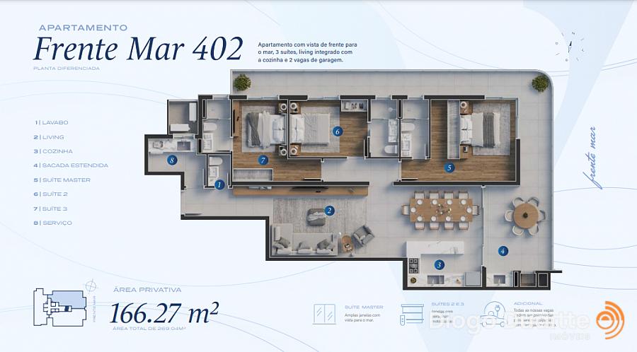 Apartamento com vista permanente para o mar, 3 suítes, living integrado com a cozinha e 2 vagas de garagem.