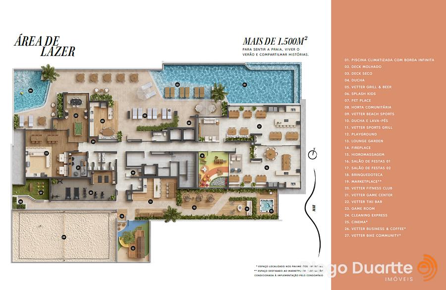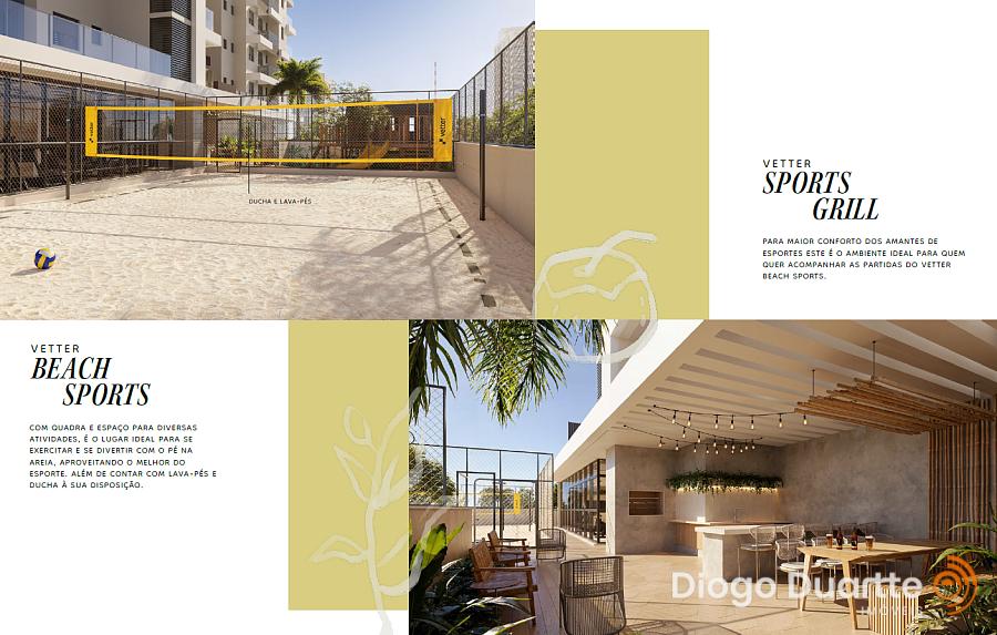 • Conveniência e lazer: Mais de 1.500m² de área de lazer, incluindo piscina climatizada com borda infinita, Vetter Grill & Beer, Splash Kids, quadra de esportes na areia, playground, hidromassagem, salões de festas integrados, brinquedoteca, cinema, Vetter Fitness Club, Game Center e muito mais.
